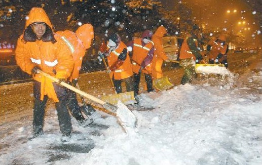 每當大雪來臨時,市民們都想快點回家,可是有一批人得準備好向外出發。 對!這就是具有“城市美容師”之稱的環衛工人。 昨日沈陽暴雪,沈陽全市的環衛工人在雪地中度過了一個寒冷的夜晚。 連夜除雪 早上還得接著干 昨夜,記者在沈陽街頭,每隔一段路程就看到一批環衛工人在掃雪。在北陵大街和昆山路交通崗北側,有20余名環衛工人在路上除雪;使脜^建管局遼河城管所北陵大街環衛班班長張東冬說,他們負責的區域就是北陵大街的全線,她早上不到6點鐘就從家出發了。 張東冬的家在西瓦窯,距離工作區域有20分鐘的路程。張東冬說:“早上還是正常的掃保作業,中午所里開會說要下大雪,下午就開始作準備,不到晚上8點就到掃保區域開始除雪了! 當記者問到除雪得干多長時間時,張東冬表示:“今天這場雪這么大,并且現在還在下,估計后半夜雪停后,還得干上一段時間,怎么也得干上一宿,北陵大街的機動車道才能見亮。明天早上還得接著除慢車道上的積雪,怎么也得連續干上24個小時,對于我們這是常事兒!” 拉開外衣 里面都結了冰晶 昨夜的大雪配合著大風天氣,雪花被風吹打到人的臉上都會有疼痛的感覺。入夜后氣溫迅速降低,夜間最低氣溫降到了-10℃。環衛工人穿著厚厚的棉衣開始在寒風中工作。張東冬告訴記者她穿了三層外衣,拉開最外層外衣的拉鎖,記者看見在外衣的里面已經結了一層冰晶。 張東冬表示,這才干了3個小時,要是干上一晚上第二天回家脫下來的內衣都能擰出水來。 夜間吃飯 迎風就雪吃下 環衛工人到了吃飯和喝水的時候是最難的了,他們到了飯點就只能在冰天雪地中吃飯。 一般到了吃飯的時候,所里會給大家帶來盒飯,白天還好些,還能在街邊的門市網點里吃飯,要是到了深夜,網點都關門了,就只能在路邊吃飯了。晚上環衛們都會吃些簡單方便的食品,沒等吃呢食物都已經涼透了,時常飛舞的雪花還會到嘴里。喝水就更難了,帶的水不一會兒就涼了,有時候還會結冰。昨夜,皇姑區建管局遼河城管所所長曲樂平接受記者采訪時表示:“全所所有的環衛都已上街除雪,會克服一切困難,保證23日早上機動車道清掃完成,明天還將對慢車道進行除雪,保證市民出行順暢! |